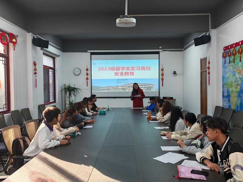 为切实做好留学生教育管理与服务工作,确保即将进行实习的留学生平安、顺利离校与离境,增强其安全意识与风险防范能力,11月11日,国际交流学院在会议室组织召开了以“平安离校,安全实习”为主题的留学生实习离校安全教育会议,2023级全体留学生参加了此次会议。