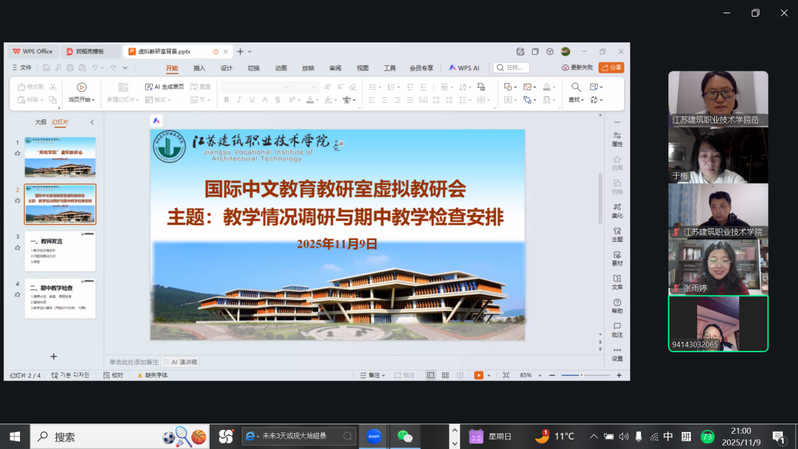 2025年11月9日晚8时,国际交流学院国际中文教育教研室借助ZOOM平台召开了线上教学研讨会,围绕“教学情况调研与期中教学检查安排”主题展开,全体专兼职教师参加了会议。